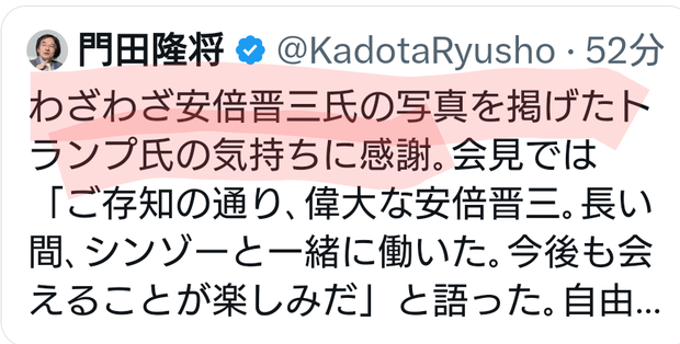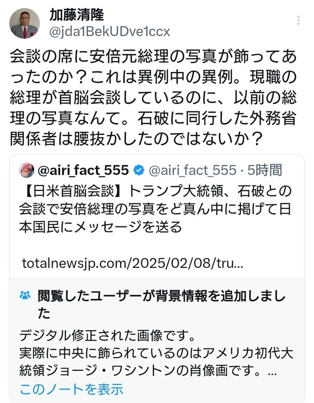 「トランプが石破との会談で安倍晋三の肖像画を掲げた」→大物保守論客続々と釣られるw