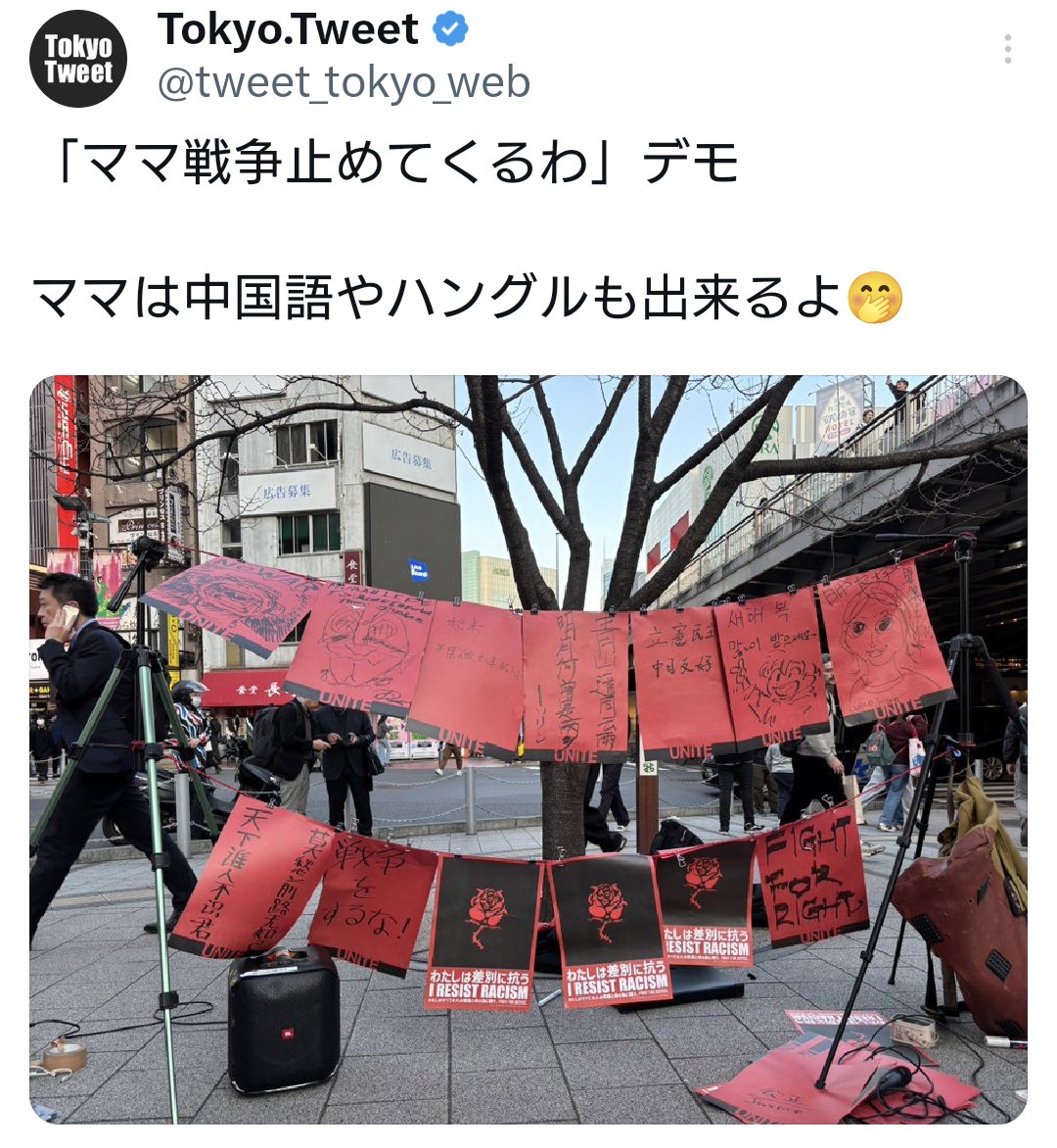 「ママ戦争止めてくるわ」デモ。何故か中国語とハングル...