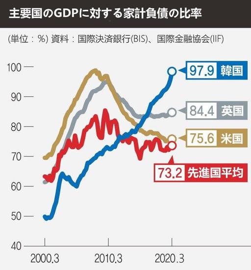 「GDPに対する家計負債比率」分析 韓国は97.9%で44カ国中5位 北欧3国など韓国より高いが 莫大な年金など直接比較は困難韓国の家計負債は過去5年間で米国や英国などの主要国を抜いて世界最高水準にまで上昇し、持ちこたえうる限界に達しつつあることが分かった。(省略)全文