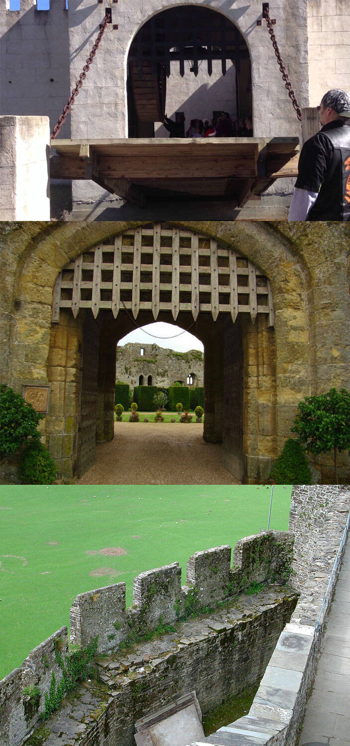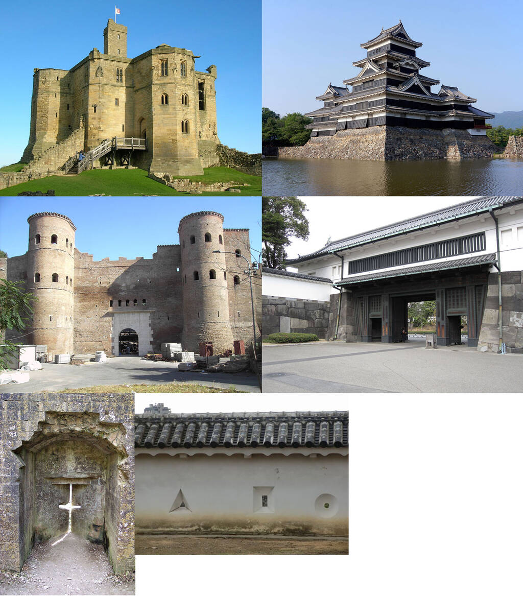 跳ね橋、落とし格子、胸壁(日本の城砦にはあまり見られない構造物)
