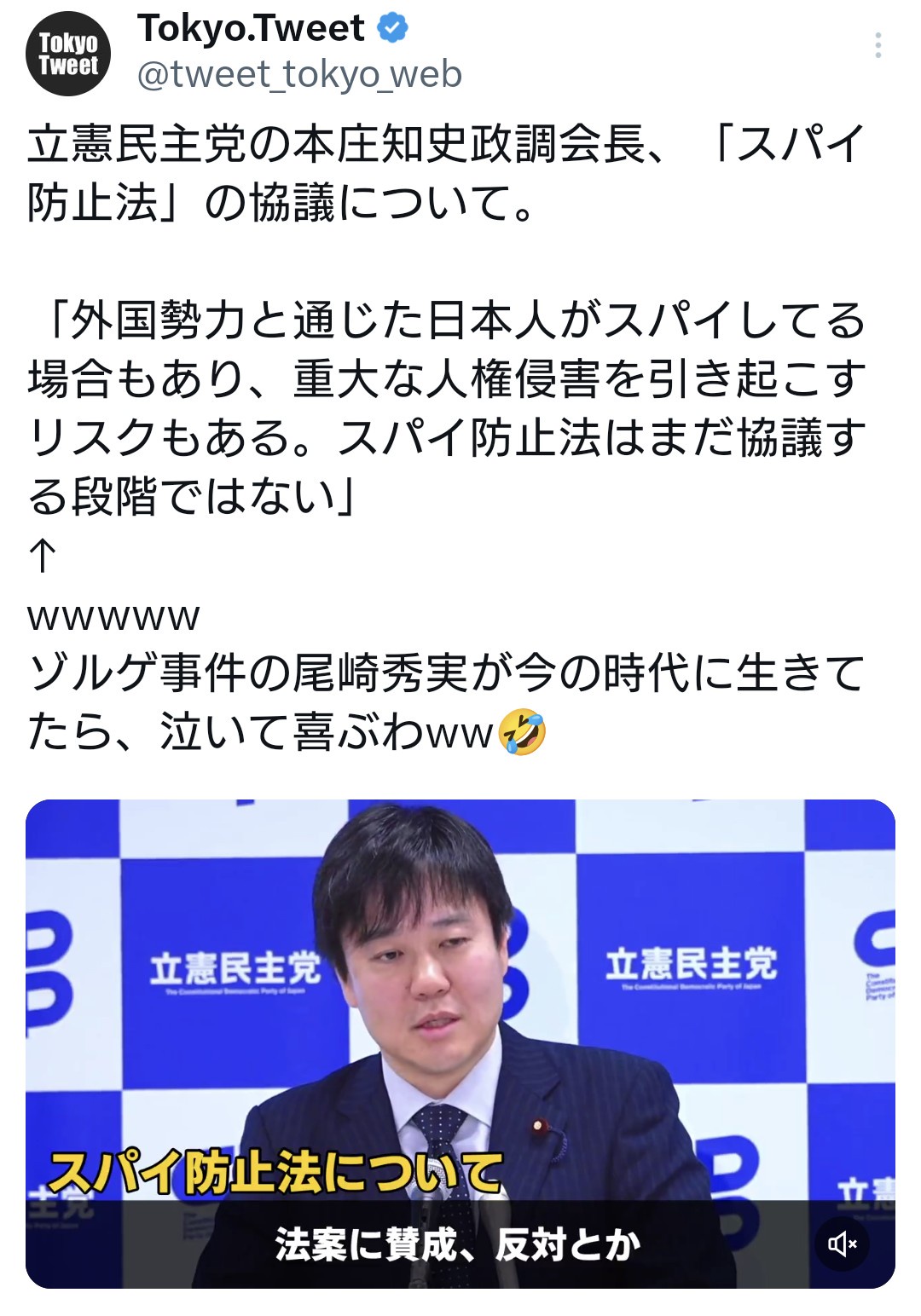 立憲民主党の本庄知史政調会長、「スパイ防止法」の協議について。 「外国勢力と通じた日本人がスパイしてる場合もあり、重大な人権侵害を引き起こすリスクもある。スパイ防止法はまだ協議する段階ではない」↑wwwwwゾルゲ事件の尾崎秀実が今の時代に生きてたら、泣いて喜ぶわww🤣
