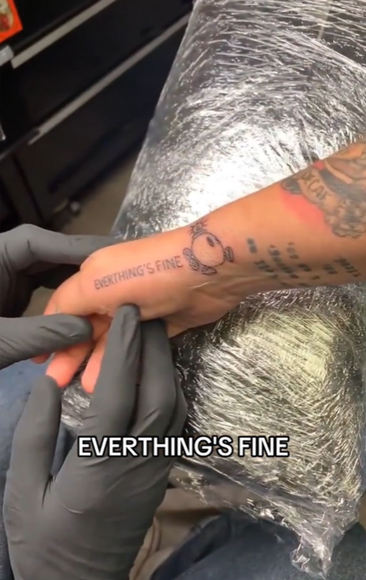 しかし完成したタトゥーをよくよく見ると、“Y”が抜けて“EVERTHING'S FINE”に!