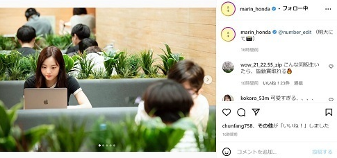 本田さんは学内でMacBookを開く姿や、机にもたれ込んでカメラに目線を向ける姿、図書館の書架の間から笑顔で顔を出した写真などを投稿。スポーツ誌『Number』の記事では、キャンパスライフについて語っています。大学生活が垣間見える写真に、ファンからは「大学生感あふれてていいっすね」「こんな同級生いたら、皆勤賞取れる」などの反響の他、「明大に編入することを誓います」「明大志願者爆増」「明大生もう一回やり直させてくれやせんか」といった声も見られました。分かる。本田真凜、在籍する明治大学でのレアな学生姿に反響 「こんな同級生いたら皆勤賞取れる」「明大志願者爆増」https://news.yahoo.co.jp/articles/9f5e6e5026e926699f1ea345c0b623dbc7b9ed37続きを読む