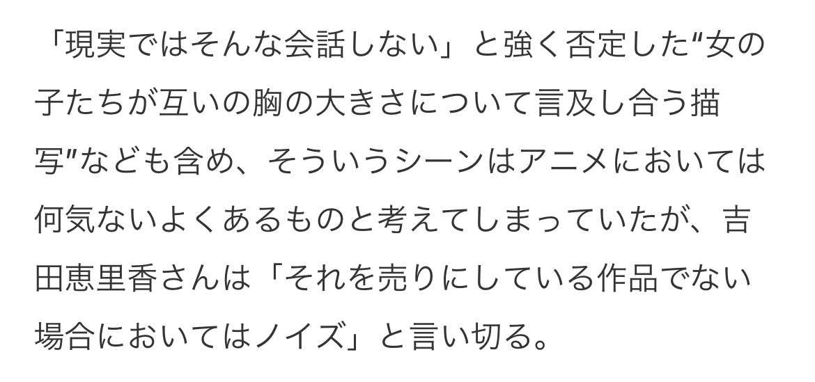 1 名前:名無しさん@おーぷん[] 投稿日:25/09/15(月) 21:57:59 ID:FJkVセクシー田中さん引き合いに出されて無事炎上中な模様『ぼっち・ざ・ろっく!』『虎に翼』の脚本家 吉田恵里香が語る、アニメと表現の“加害性”https://t.co/aeKppQuqXJ 覇権を狙うため『ぼざろ』から排除したノイズとは?──最新作『前橋ウィッチーズ』まで、吉田さんが独自の哲学を明かしたトークショーの模様をレポート??? pic.twitter.com/k4LQUqapay— KAI-YOU(カイユウ) (@KAI_YOU_ed) September 14, 2025 3 名前:名無しさん@おーぷん[] 投稿日:25/09/15(月) 21:59:53 ID:FJkV