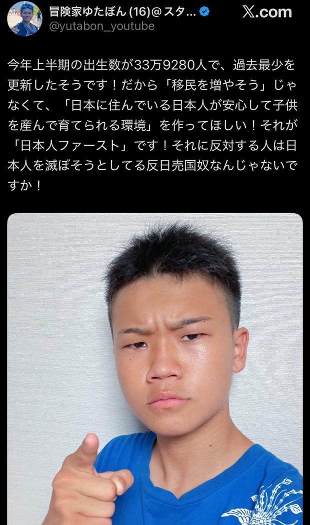 今年上半期の出生数が33万9280人で、過去最少を更新したそうです!だから「移民を増やそう」じゃなくて、「日本に住んでいる日本人が安心して子供を産んで育てられる環境」を作ってほしい!それが「日本人ファースト」です!それに反対する人は日本人を滅ぼそうとしてる反日売国奴なんじゃないですか!