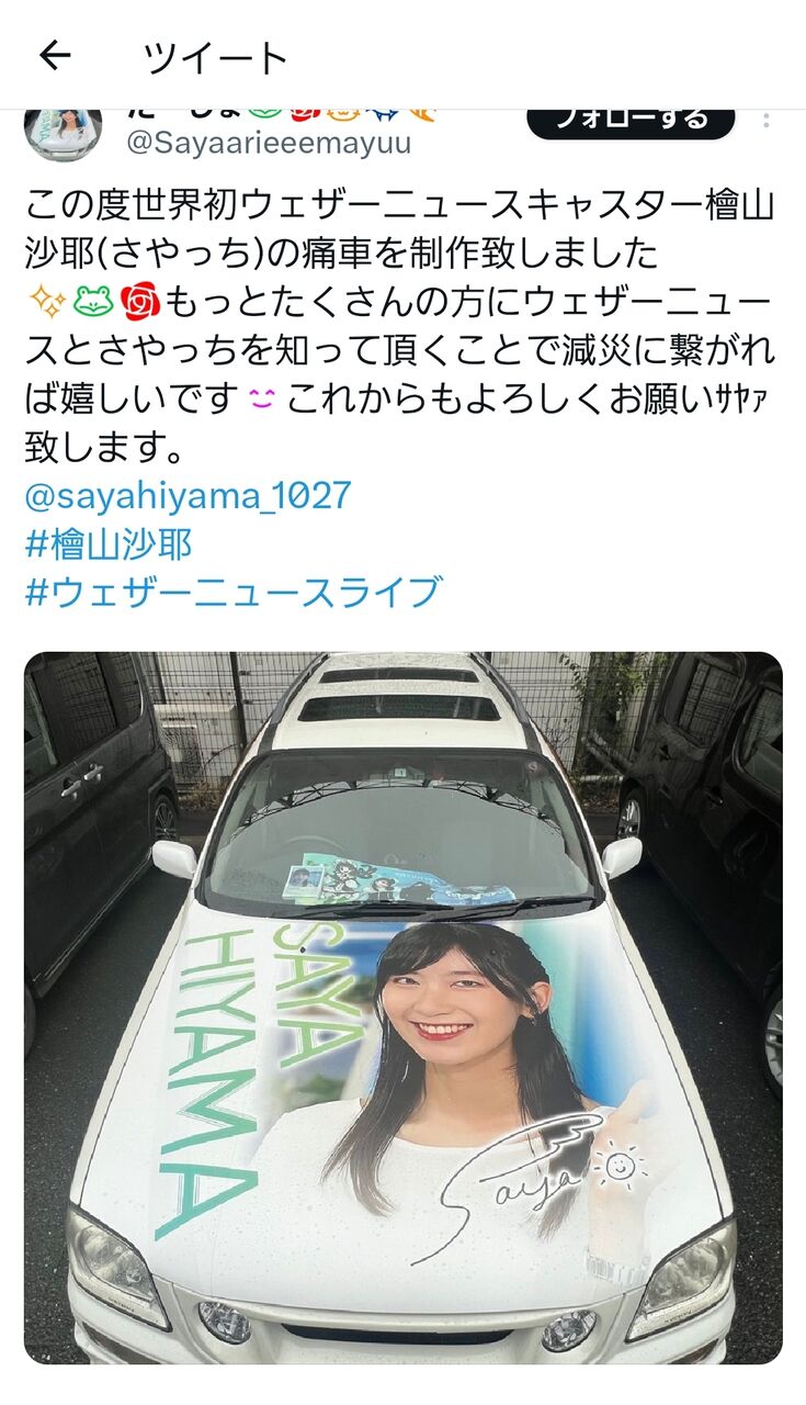 【悲報】ウェザーニュース檜山沙耶(29)、ファンに痛車を作られる
