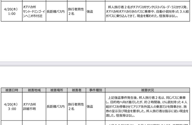 2 : 以下、?ちゃんねるからVIPがお送りします :2024/04/26(金) 13:04:03.740 ID:Sgq93ykfH.netワロタhttps://www.mx.emb-japan.go.jp/files/100616344.pdf(PDF注意)3 : 以下、?ちゃんねるからVIPがお送りします :2024/04/26(金) 13:05:04.888 ID:Sgq93ykfH.net4/20(木) 1:00オアハカ州 サント・ドミンゴ・イ ンヘニオ市付近長距離バス内旅行者男性 2名強盗邦人旅行者2名がチアパス州サンクリストバル・デ・ラスカサス発、 オアハカ州オアハカ行きのバスに乗車中、自動小銃を持った3人組4/20(木) 3:00オアハカ州 詳細不明長距離バス内旅行者男性 2名強盗上記強盗事件発生後、邦人旅行者2名は、同じバスに乗車 し、目的地へ向け進行したが、約2時間後、けん銃を持った4人 組がバスを停車させてアジア系外国人の乗客だけを降車させ、旅 券の呈示及び現金を要求した。邦人旅行者は指示に従い現金を 渡した。怪我等はなし。転載元スレッド:https://viper.2ch.sc/test/read.cgi/news4vip/1714104235/