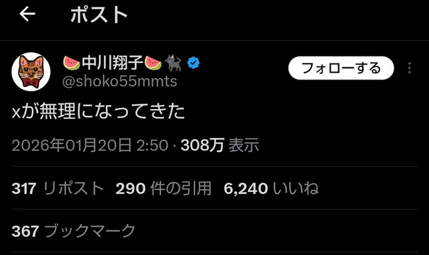 xが無理になってきた— 🍉中川翔子🍉🐈⬛ (@shoko55mmts)