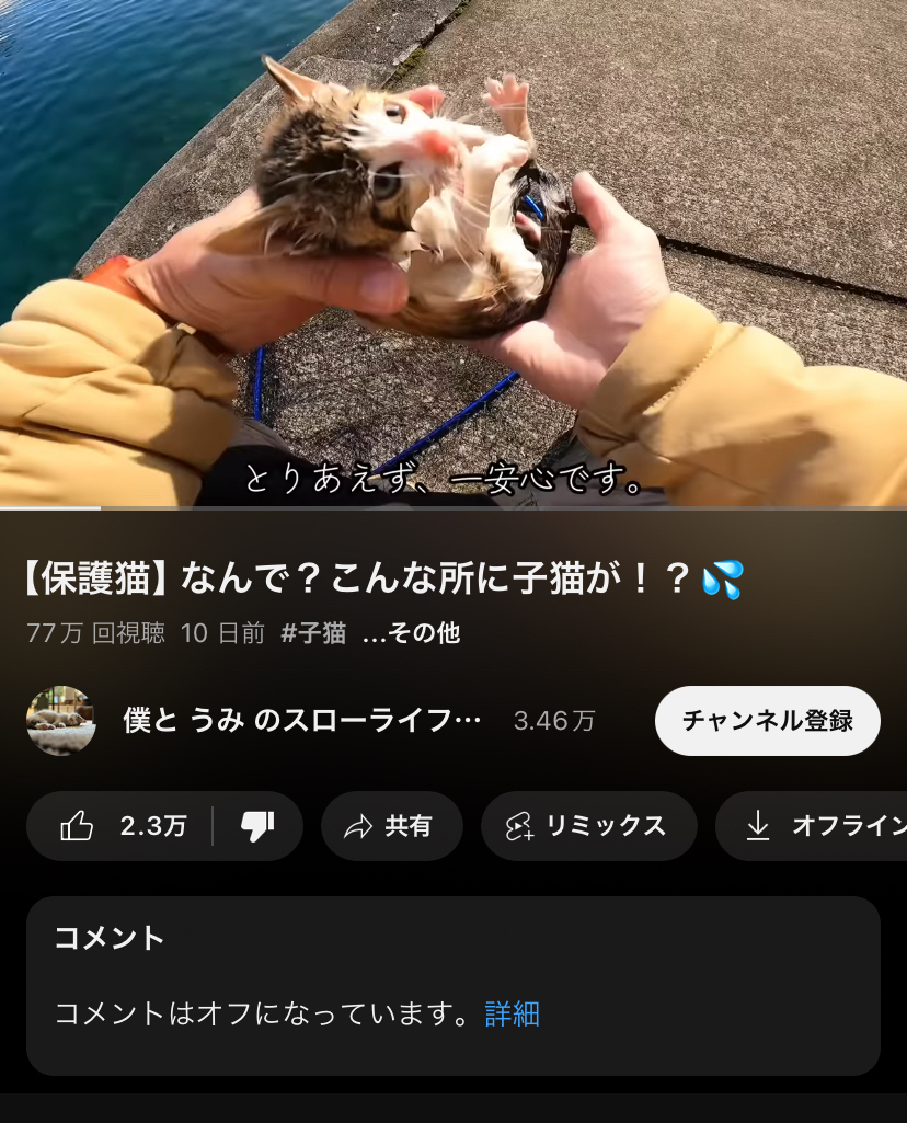 【悲報】例の釣り中に偶然海で溺れた子猫を拾ったYouTuber、遂にコメント閉鎖