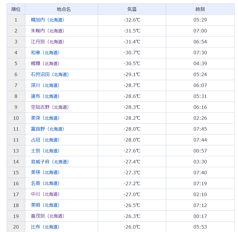 【悲報】北海道、-32℃まで気温が下がる!!!!!!!!