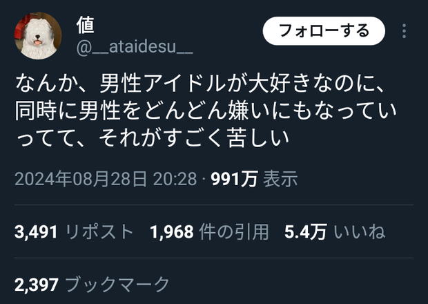 【悲報】女さん「男アイドルは好きだけど現実の男は嫌い」→5.4万いいね!