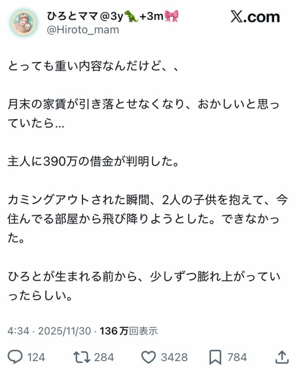とっても重い内容なんだけど、、月末の家賃が引き落とせなくなり、おかしいと思っていたら…主人に390万の借金が判明した。カミングアウトされた瞬間、2人の子供を抱えて、今住んでる部屋から飛び降りようとした。できなかった。ひろとが生まれる前から、少しずつ膨れ上がっていったらしい。— ひろとママ@3y🦖+4m🎀 (@Hiroto_mam) November 29, 2025転載元スレッド:https://viper.2ch.sc/test/read.cgi/news4vip/1764565999/続きを読む