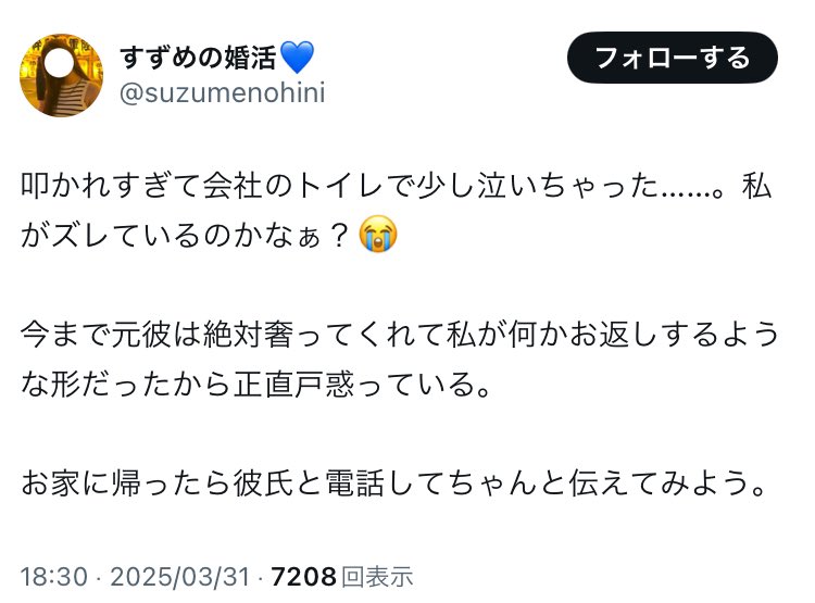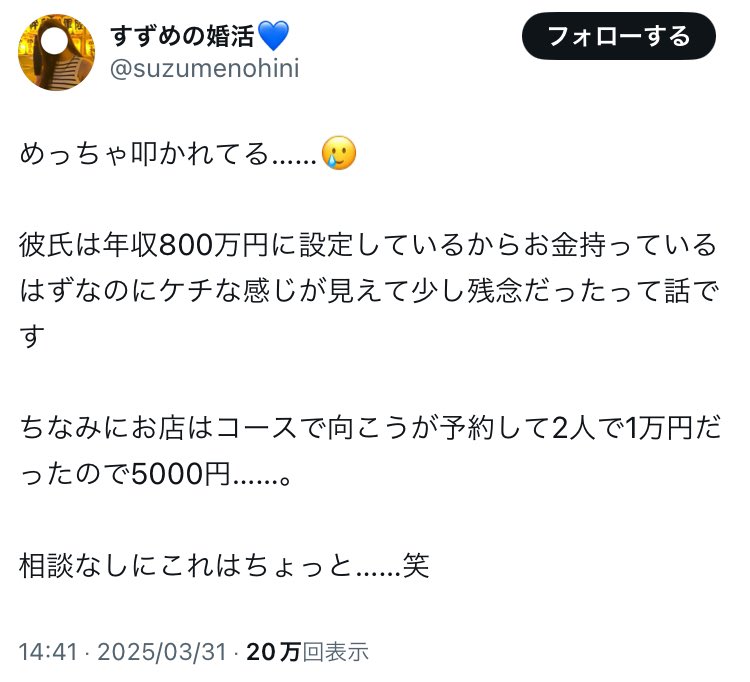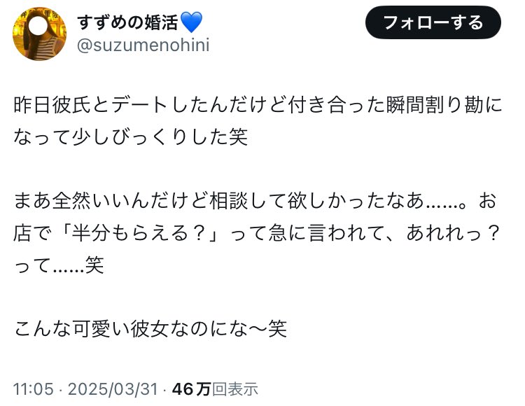 ????「彼氏が割り勘してきてびっくりした笑こんな可愛い彼女なのにな?笑」↓????「向こうが5,000円のお店予約して割り勘。相談なしでこれはちょっと...笑」↓????「会社のトイレで泣いちゃった??」???29歳にもなって"コレ"なの、売れてないピン芸人よりおもろくてすき https://t.co/07trhB77O7 pic.twitter.com/uASSz6G6VV— メロソンーダ?? (@mask_watermelon) March 31, 2025 3 名前:名無しさん@おーぷん[] 投稿日:25/04/01(火) 07:44:23 ID:GbUY売れてるピン芸人のが少ないだろ5 名前:名無しさん@おーぷん[] 投稿日:25/04/01(火) 07:44:31 ID:GbUYピン芸人は売れないだろ8 名前:名無しさん@おーぷん[] 投稿日:25/04/01(火) 07:45:00 ID:optw29とか女としての価値ほとんど残ってないだろ女さんは客観的に自分の価値を見れないんか?9 名前:名無しさん@おーぷん[] 投稿日:25/04/01(火) 07:45:46 ID:cuudだから29になっても独身なんだぞこれが1番の正論続きを読む