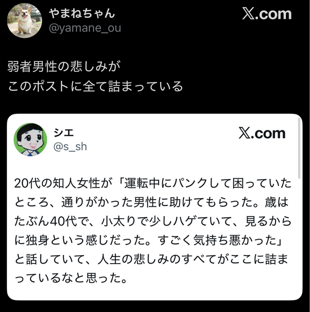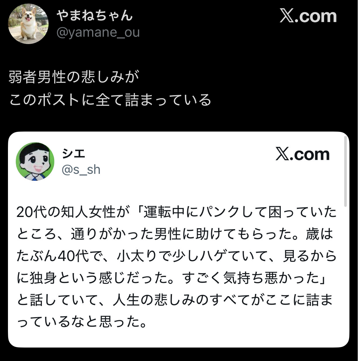 弱者男性の悲しみがこのポストに全て詰まっている pic.twitter.com/gtbRFnp656— やまねちゃん (@yamane_ou) November 29, 20252 : 以下、?ちゃんねるからVIPがお送りします :2025/11/30(日) 16:31:18.994 ID:R5+GPLvq0.net弱男どーすんのこれ転載元スレッド:https://viper.2ch.sc/test/read.cgi/news4vip/1764487848/