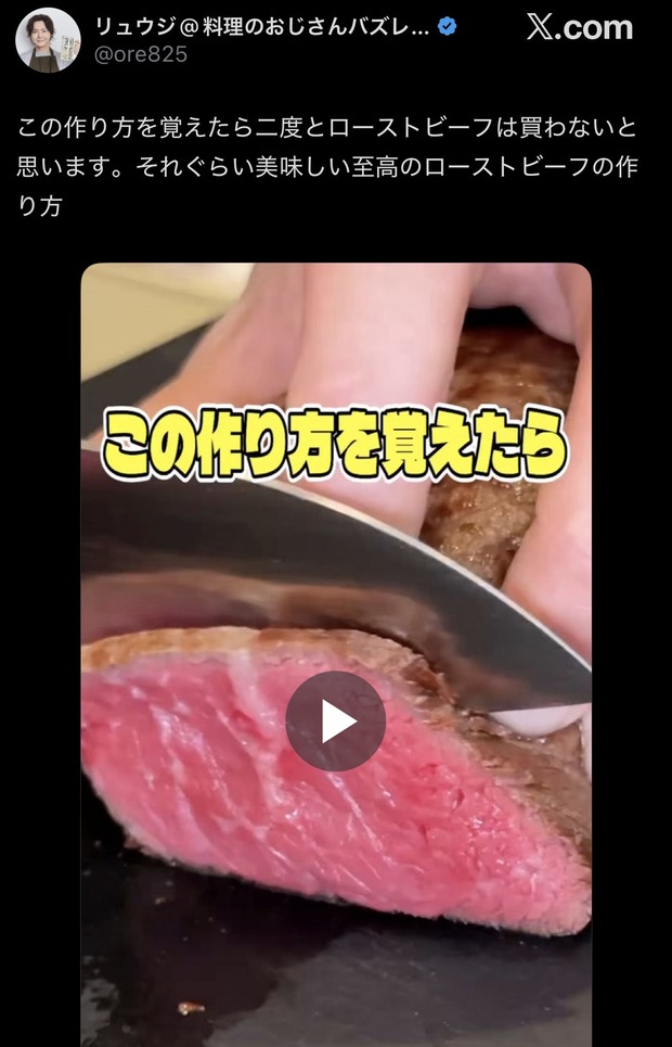 この作り方を覚えたら二度とローストビーフは買わないと思います。それぐらい美味しい至高のローストビーフの作り方 pic.twitter.com/0GJYThFKJW— リュウジ@料理のおじさんバズレシピ (@ore825) December 20, 2025転載元スレッド:https://viper.2ch.sc/test/read.cgi/news4vip/1766289255/