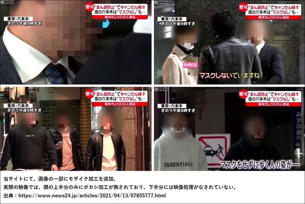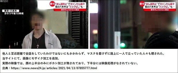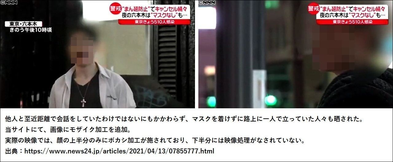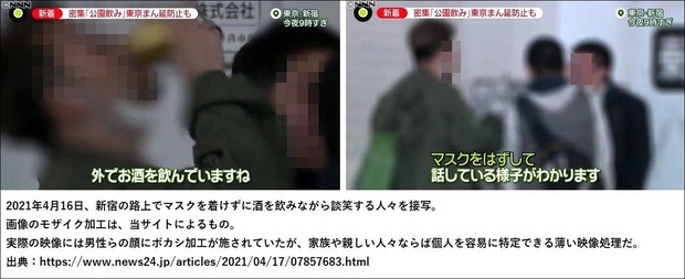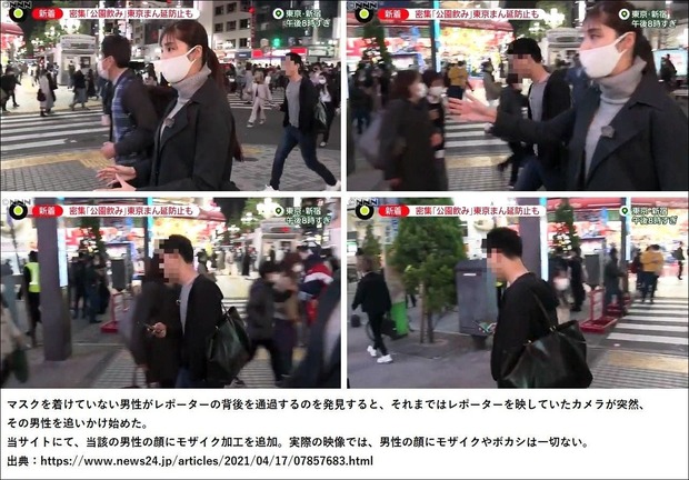 なお、日テレは4月16日にも、公園内で密集して酒を飲む人々や、都内の路上の様子を撮影した。その際、マスクを着けていない通行人をカメラが追いかけたが、その人物の顔にボカシ加工は一切なかった。