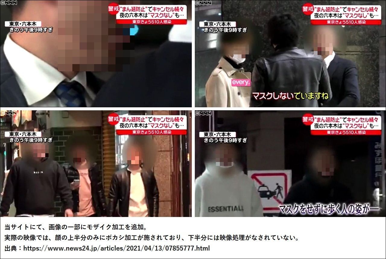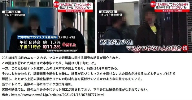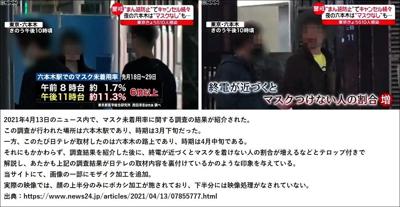 1 ::2021/04/20(火) 13:12:36.48 ID:KYSXWPGv0「屋外でマスクを着用していない人々を無断撮影し、その映像をニュース番組で流す日本テレビの報道は盗撮行為に等しく、悪質だ」という意見が、読者から寄せられた。一例が2021年4月13日の放送であり、夜の六本木にはマスクを着けていない人々が目立つと報じている。(略)マスクを着けずに談笑する男性を接写し、顔の下半分を晒した。続いて、路上でマスクを着けずに話す人々を至近距離から撮影し、顔の上半分のみにボカシ加工を施した映像を流した。さらに、「向こうから歩いてくる3人組、3人ともマスクしていませんね」などと実況。