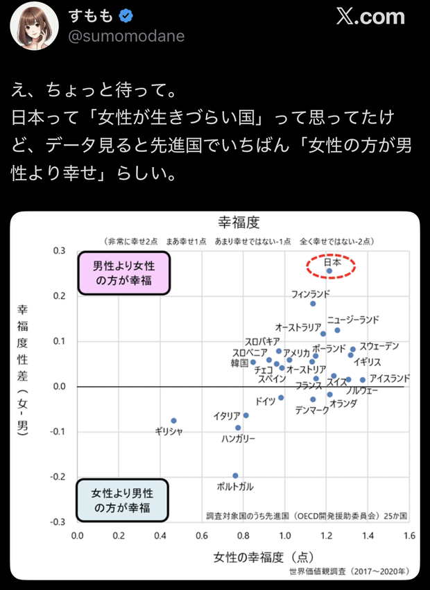 え、ちょっと待って。日本って「女性が生きづらい国」って思ってたけど、データ見ると先進国でいちばん「女性の方が男性より幸せ」らしい。 pic.twitter.com/yyJJFcx21K— すもも (@sumomodane) December 27, 20252 : 以下、?ちゃんねるからVIPがお送りします :2025/12/29(月) 19:06:07.831 ID:O4MFmwmv0NIKU.net弱男どーすんのこれ転載元スレッド:https://viper.2ch.sc/test/read.cgi/news4vip/1767002741/続きを読む