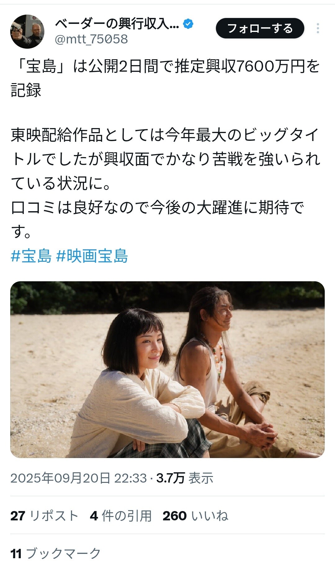 1 名前:名無しさん@おーぷん[] 投稿日:25/09/21(日) 19:00:18 ID:j6Jr上映時間&映館数のコンボだけでも契約料50億超えてるのにどうすんの?5 名前:名無しさん@おーぷん[] 投稿日:25/09/21(日) 19:01:49 ID:LNvCどんな映画なん?6 名前:名無しさん@おーぷん[] 投稿日:25/09/21(日) 19:01:57 ID:0iCh似た名前の映画を作るのやめいや8 名前:名無しさん@おーぷん[] 投稿日:25/09/21(日) 19:02:39 ID:j6Jr>>6上映時間191分やで7 名前:名無しさん@おーぷん[] 投稿日:25/09/21(日) 19:02:10 ID:j6Jr興行収入速報値ソース