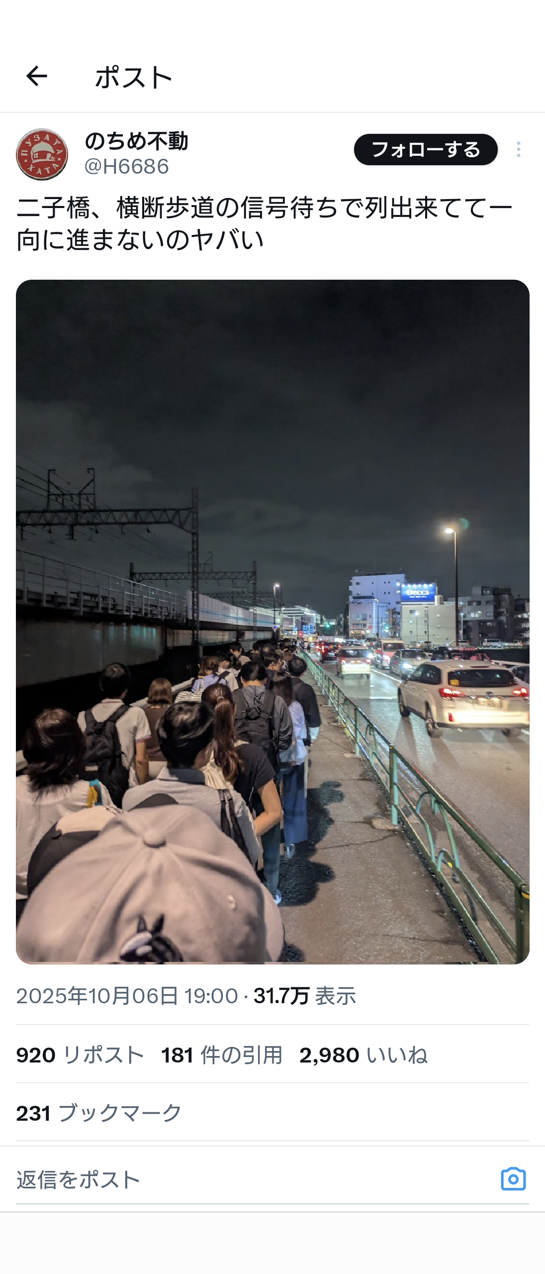 二子橋、横断歩道の信号待ちで列出来てて一向に進まないのヤバい pic.twitter.com/PmimHMyxmI— のちめ不動 (@H6686) October 6, 20252 : 以下、?ちゃんねるからVIPがお送りします :2025/10/06(月) 21:14:02.039 ID:eNlZVVXv0.netかわいそうすぎるまだ月曜日だよ転載元スレッド:https://viper.2ch.sc/test/read.cgi/news4vip/1759752792/
