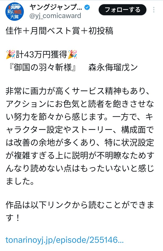 ここで読めるhttps://tonarinoyj.jp/episode/2551460909505785119【ヤングジャンプ】AIが漫画の新人賞を受賞する時代になりました【御国の羽々斬様】|バチンウニhttps://note.com/prime_hebe780/n/nfba198c86401転載元スレッド:https://viper.2ch.sc/test/read.cgi/news4vip/1764150570/