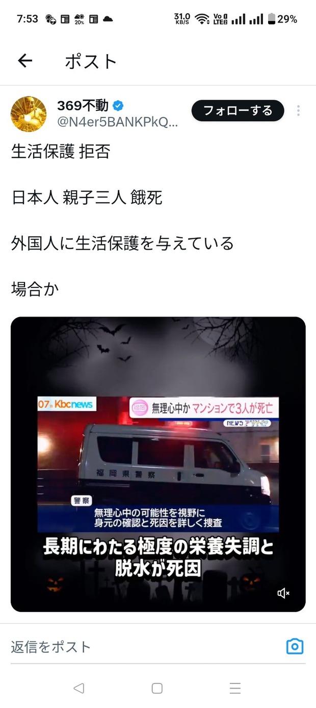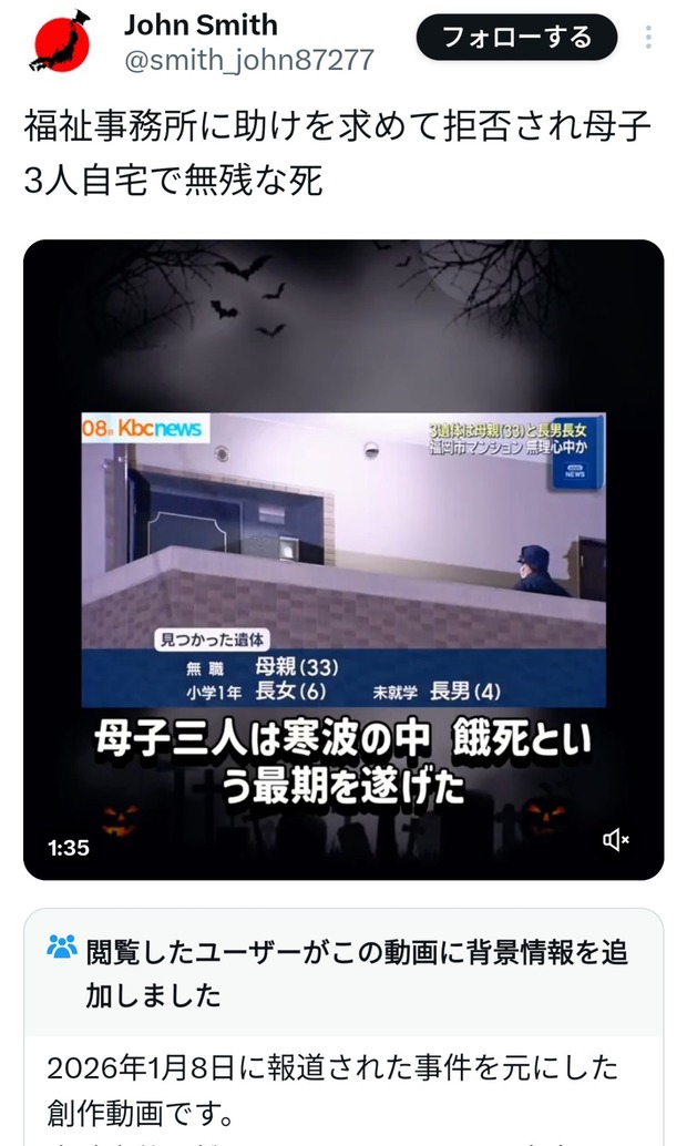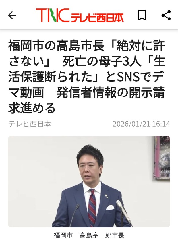 【悲報】福岡の親子三人無理心中事件、SNS上で「生活保護を断られて餓死」とデマが流される→福岡市激怒で開示請求へ