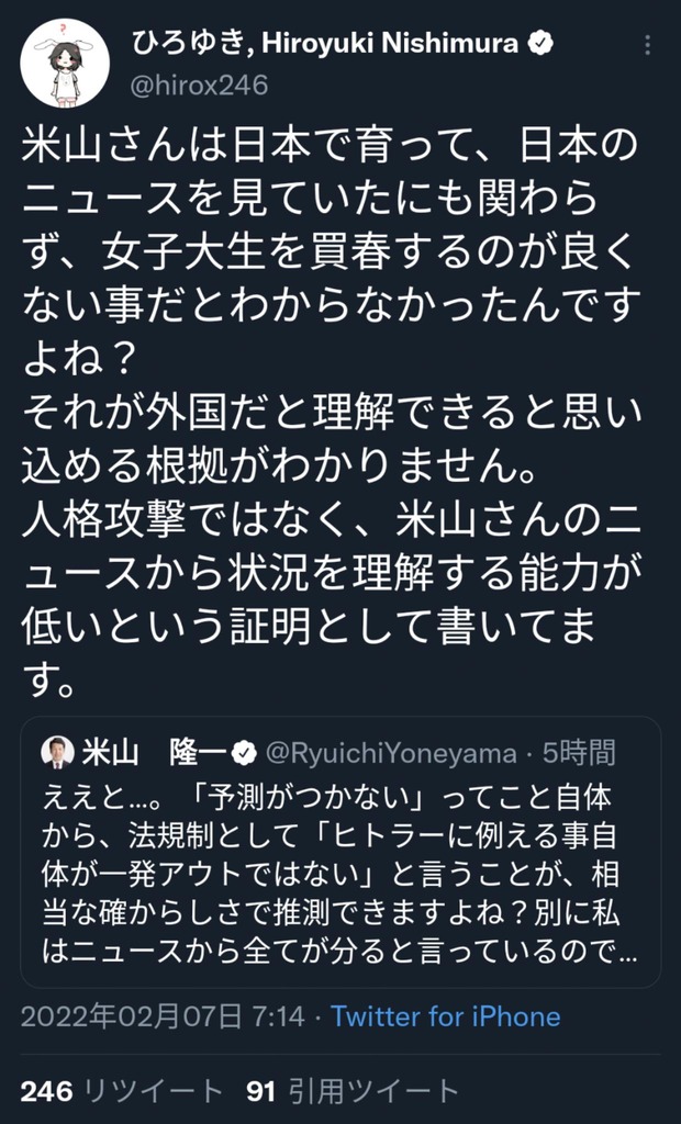↓ひ(やべぇ、確かにそうや🤯)ひ「米山さんは日本育ちなのに買春が良くない事だと知らなかったんですよね?そんな人がニュースをマトモに理解できるとは思えません😣」ひ(頼む・・・推測の話から離れてくれ・・・🙏)