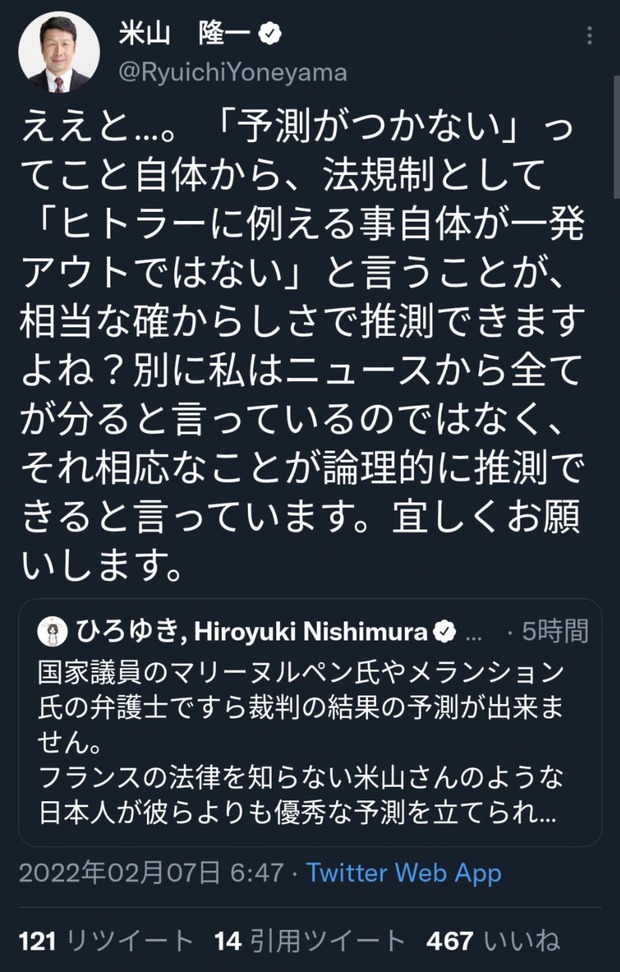↓米「予測ができないなら、『ヒトラーに例えること自体が一発アウトではない』と推測できるやろ・・・😨」