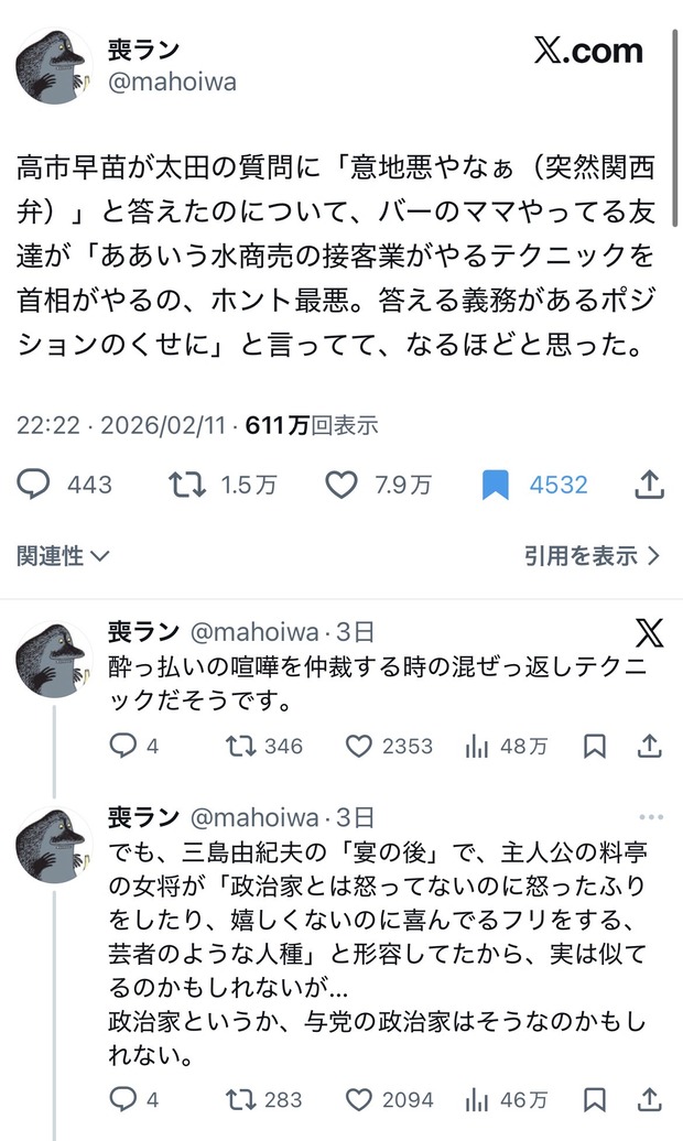 https://x.com/mahoiwa/status/2021575684527689980?s=46転載元スレッド:https://viper.2ch.sc/test/read.cgi/news4vip/1771124728/