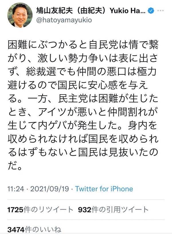 1 : 風吹けば名無し :2021/11/01(月) 10:28:09.32 ID:jsk5T66fd困難にぶつかると自民党は情で繋がり、激しい勢力争いは表に出さず、総裁選でも仲間の悪口は極力避けるので国民に安心感を与える。一方、民主党は困難が生じたとき、アイツが悪いと仲間割れが生じて内ゲバが発生した。身内を収められなければ国民を収められるはずもないと国民は見抜いたのだ。— 鳩山友紀夫(由紀夫)Yukio Hatoyama (@hatoyamayukio) September 19, 2021
