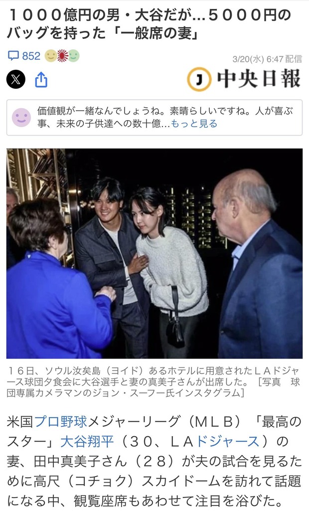 1000億円の男・大谷だが…5000円のバッグを持った「一般席の妻」(中央日報日本語版) - Yahoo!ニュース