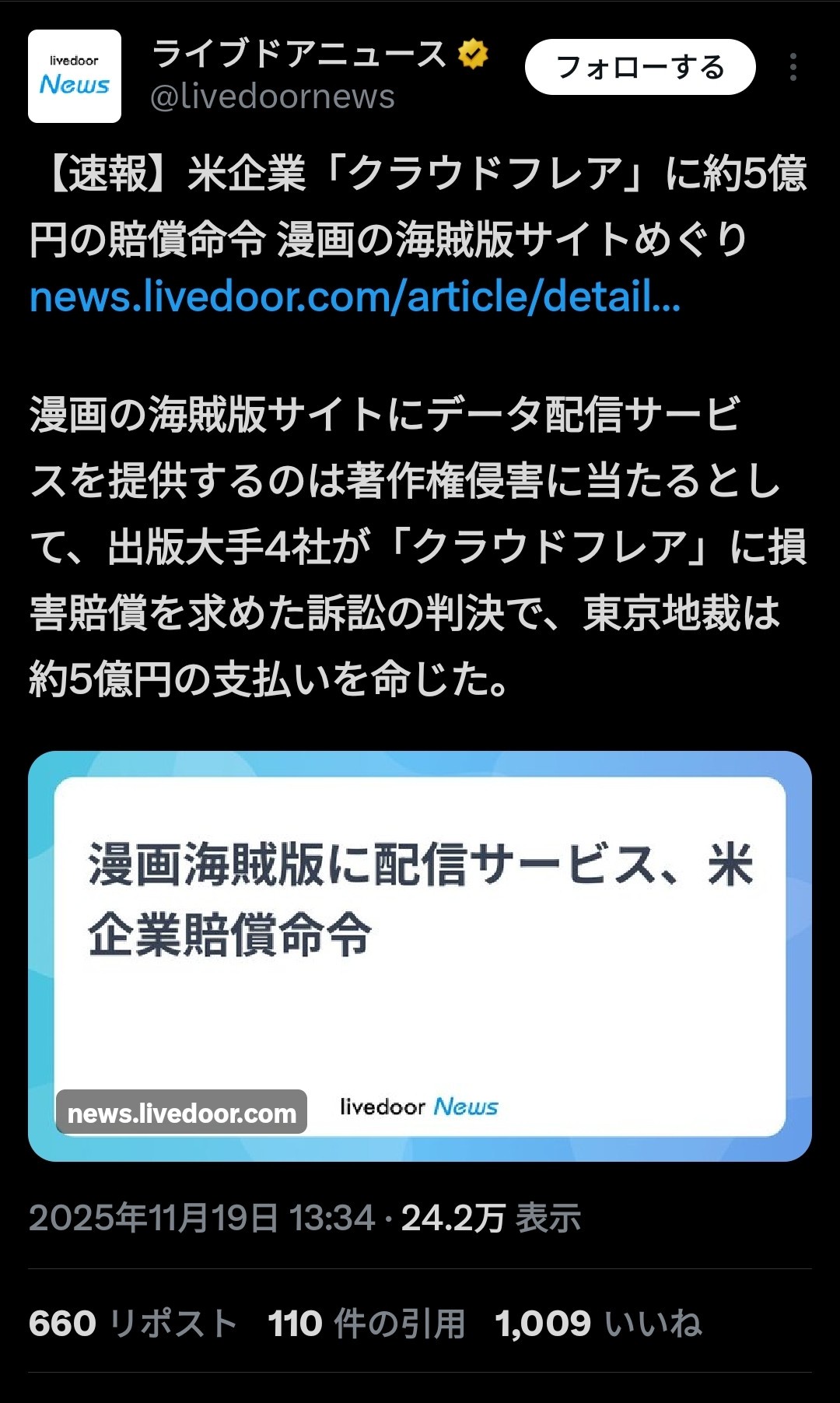 海賊版サイトめぐり米・クラウドフレアに総額約5億円賠償命令 東京地裁 「ONE PIECE」や「進撃の巨人」も被害 - ライブドアニュースhttps://news.livedoor.com/article/detail/30020029/転載元スレッド:https://viper.2ch.sc/test/read.cgi/news4vip/1763553995/