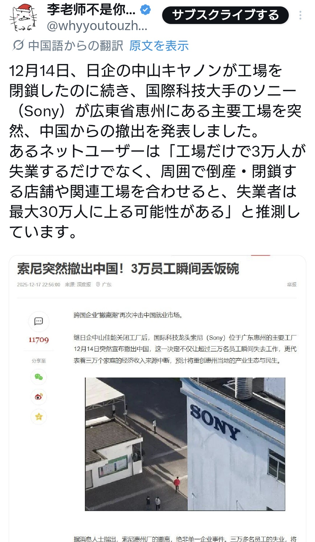 【悲報】SONYが中国の工場を閉鎖。3万人が失業、最大で30万人の失業者が出る模様