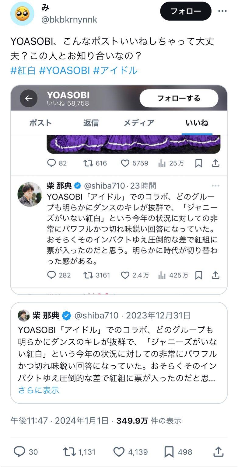 【悲報】YOASOBIさん、「ジャニーズがいない紅白」というツイートにいいねして炎上wwwwww
