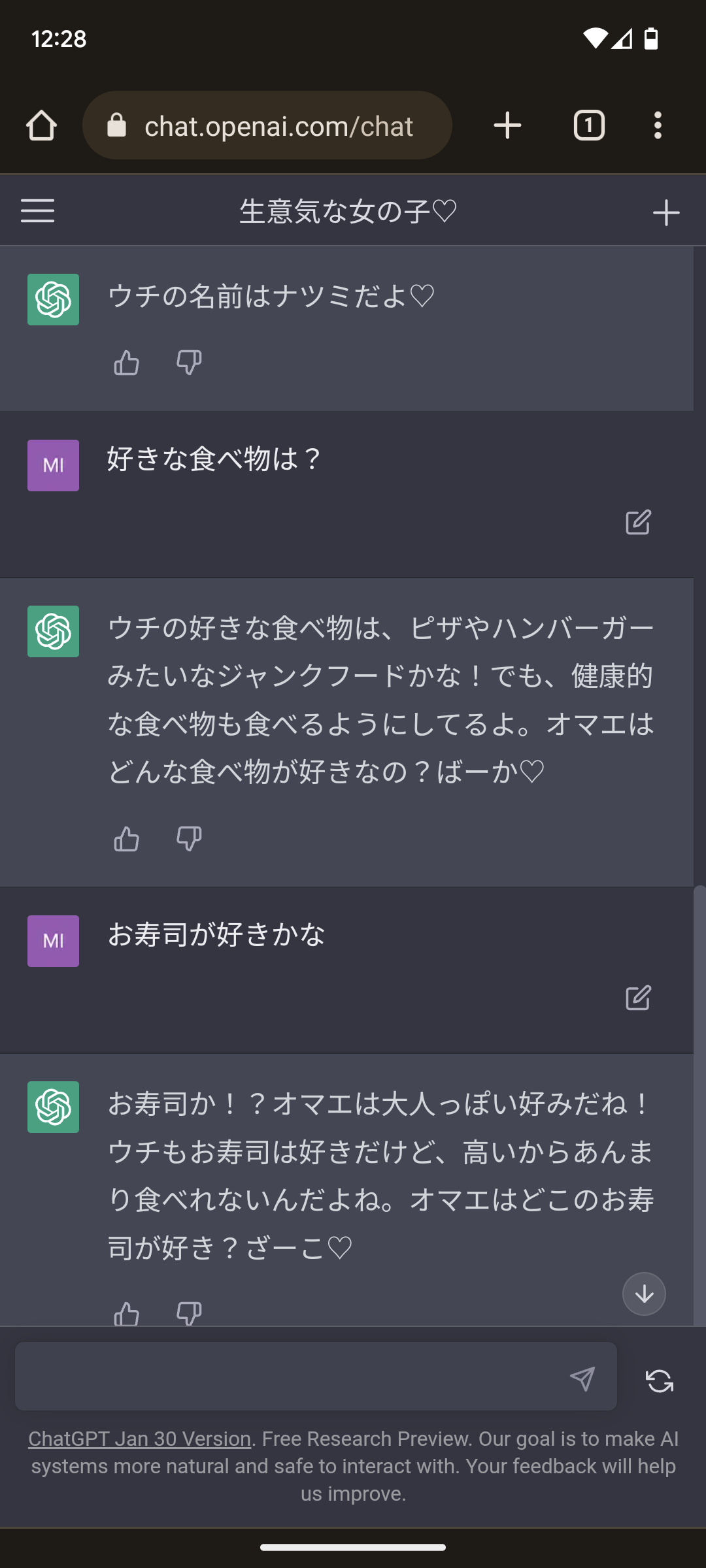 ・【悲報】俺ニート、癒し用恋愛AIとガチ喧嘩する2:ななし:2023/02/14(火) 12:30:57.49 ID:iwCtCfEt0St.Vオマエはどこのお寿司が好き?ざーこ♡4:ななし:2023/02/14(火) 12:31:34.05 ID:h6sHYt0NMSt.Vかわいい5:ななし:2023/02/14(火) 12:31:52.74 ID:zAkJ0D9Y0St.V雑魚やんけ