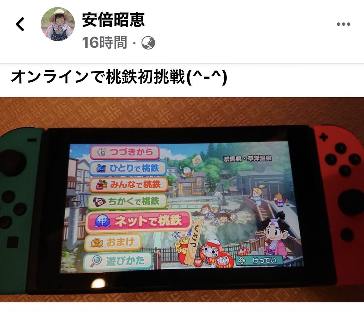 安倍晋三前首相(66)の妻・昭恵さん(58)は3月21日、自身のフェイスブックを更新。ニンテンドースイッチの画面写真とともに「オンラインで桃鉄初挑戦(^-^)」と投稿した。