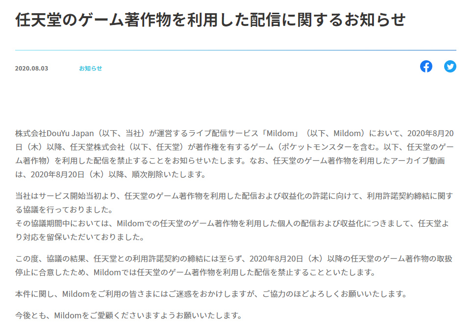 関連ゲーム配信サービス『ミルダム』 任天堂ゲーム著作物を利用したゲーム動画禁止に