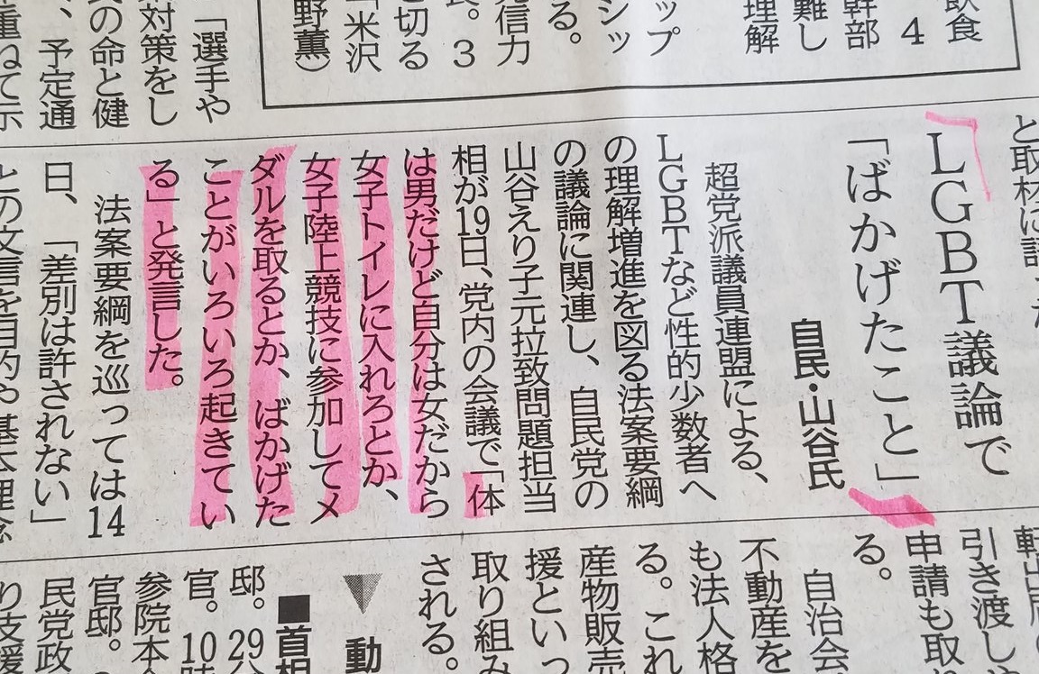 自民党・山谷えり子議員が「体は男だけど自分は女だから女子トイレに入れろとか、アメリカなんかでは女子陸上競技に参加してしまってダーッとメダルを取るとか、ばかげたことは起きている」と発言。トランスヘイトが自民党保守派と合流し非常に危険。命を脅かしている。→