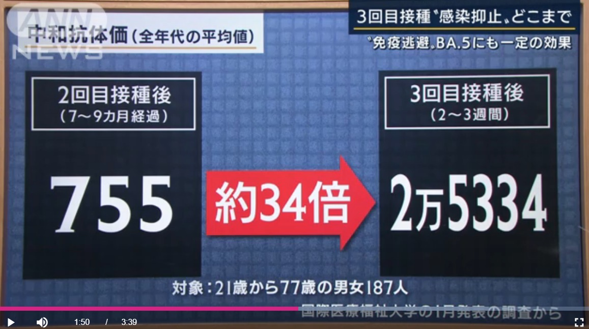 18日の全国の新型コロナウイルスの新規感染者は7万6198人で、月曜日としては過去最多となりました。17日まで3日連続で10万人以上が感染。第6波のとき、10万人を超えたのは1日だけでした。去年、おととしは7月の連休明け、感染者が急増した傾向を考えると、今年もさらに増えてもおかしくない状況です。政府が対策の一つに挙げているのが、ワクチン接種の加速。周囲を守ることにつながると、加速を呼び掛けているのが、3回目接種です。今月15日時点で、接種率は62.3%。年代別に見ると、60~64歳までは、約83%と高いですが、20代は46.4%、10代は31.6%にとどまっています。国際医療福祉大学の研究データによりますと、2回目接種から7~9カ月経過した人に、3回目接種後、ウイルスの働きを抑える中和抗体価がどう変化したかというと、約34倍増えたといいます。国際医療福祉大学・松本哲哉主任教授は、「ワクチン2回のみ接種者のほとんどは、去年打った人で、今は、極端に抗体価が下がり“無防備状態”。BA.5は免疫逃避しやすい特性があるが、3回目接種で、一定程度の効果が期待できる」と話します。“一定の効果”とは、重症化予防、後遺症リスクの軽減、人にうつす期間を2~3日に短縮するなどです。https://news.tv-asahi.co.jp/news_society/articles/000262022.html 続きを読む