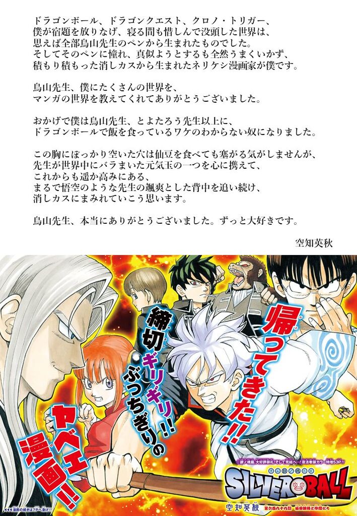 【画像】『銀魂』の作者・空知英秋、鳥山明への追悼でふざけてしまう