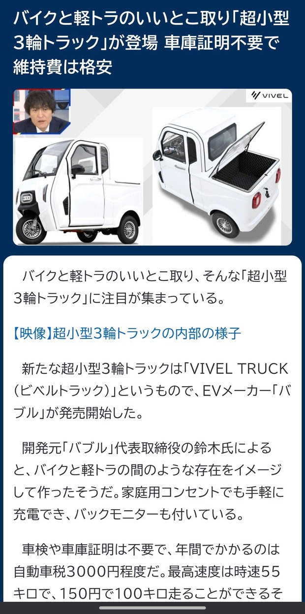 バイクと軽トラのいいとこ取り「超小型3輪トラック」が登場 車庫証明不要で維持費は格安https://news.tv-asahi.co.jp/news_economy/articles/900181985.html転載元スレッド:https://viper.2ch.sc/test/read.cgi/news4vip/1768721262/