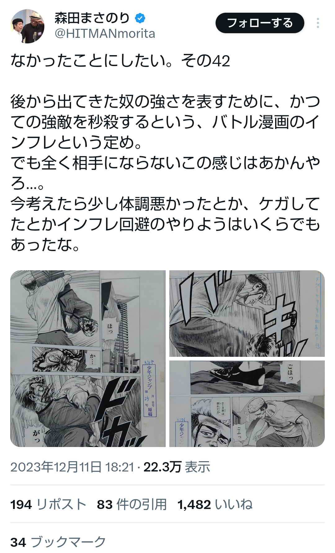 なかったことにしたい。その42後から出てきた奴の強さを表すために、かつての強敵を秒殺するという、バトル漫画のインフレという定め。でも全く相手にならないこの感じはあかんやろ…。今考えたら少し体調悪かったとか、ケガしてたとかインフレ回避のやりようはいくらでもあったな。 pic.twitter.com/kqE2KZ3GNC— 森田まさのり (@HITMANmorita) December 11, 2023転載元スレッド:https://viper.2ch.sc/test/read.cgi/news4vip/1753840805/続きを読む