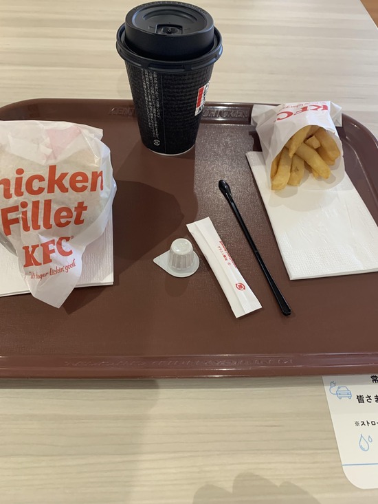 チキンフィレサンド、コーヒー、ポテト