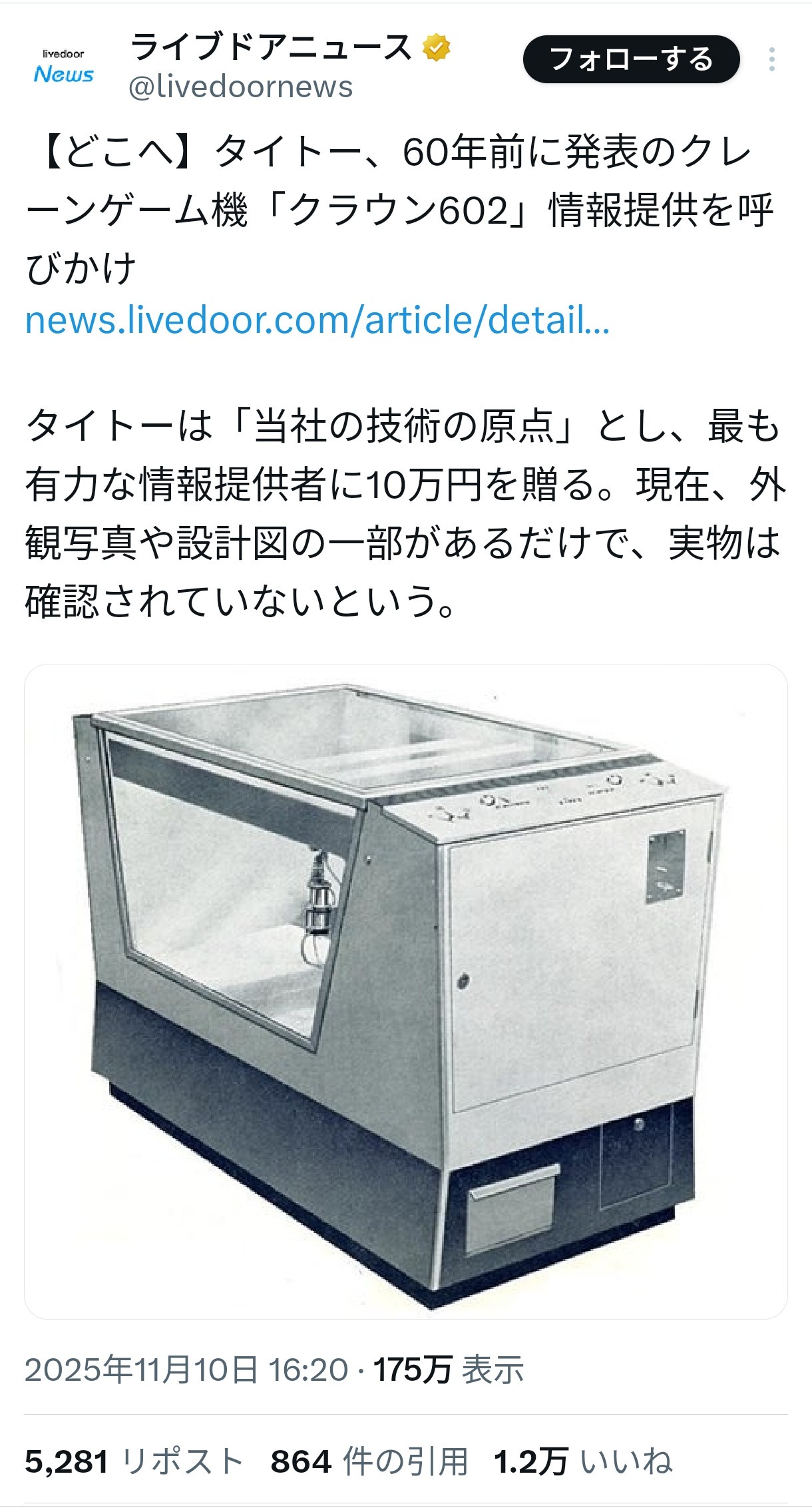 【どこへ】タイトー、60年前に発表のクレーンゲーム機「クラウン602」情報提供を呼びかけhttps://t.co/CRY5Tgv2u3タイトーは「当社の技術の原点」とし、最も有力な情報提供者に10万円を贈る。現在、外観写真や設計図の一部があるだけで、実物は確認されていないという。 pic.twitter.com/jZWfzCO3Dw— ライブドアニュース (@livedoornews) November 10, 20252 : 以下、?ちゃんねるからVIPがお送りします :2025/11/10(月) 21:48:17.733 ID:y73248/i0.net知らね?転載元スレッド:https://viper.2ch.sc/test/read.cgi/news4vip/1762778890/続きを読む