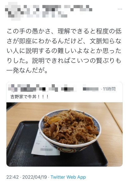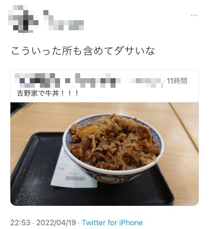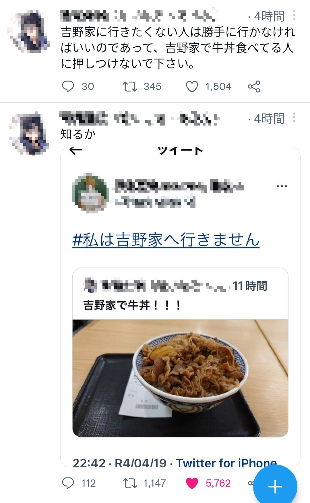 【画像】ツイッタラー「吉野家で牛丼食べた!」→フェミ「ギャオッ!ギャオッ!ギャオオオオオ!!!」