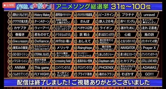 【画像】テレ朝アニソンランキングTOP10、不可解だと話題にwwwwwwww