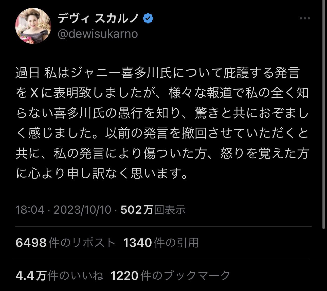 【画像】デヴィ夫人、ジャニー喜多川を擁護していたことをXで謝罪www