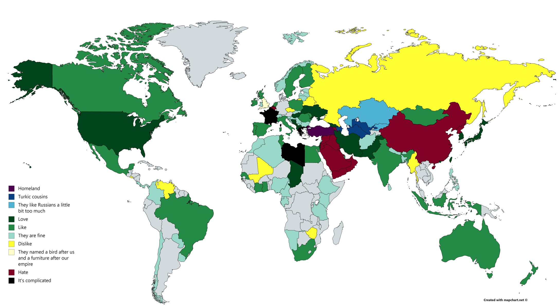 【画像】トルコ人「好きな国と嫌いな国で色分けしてみたwww」