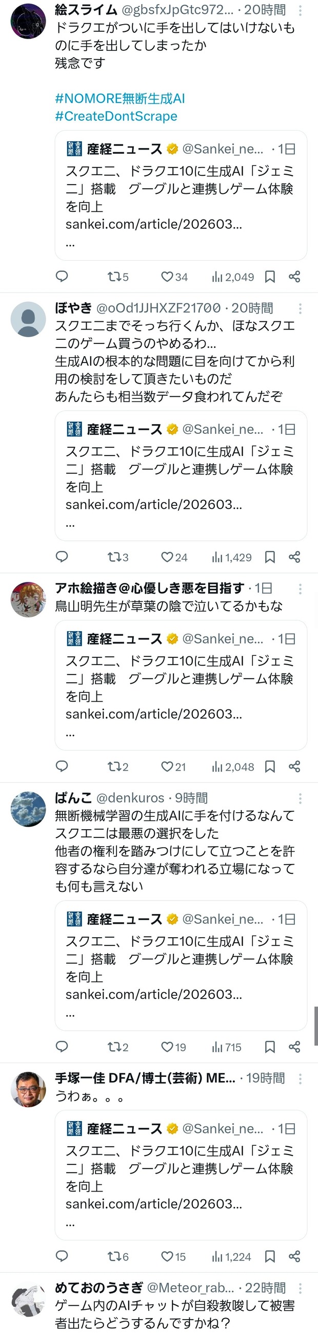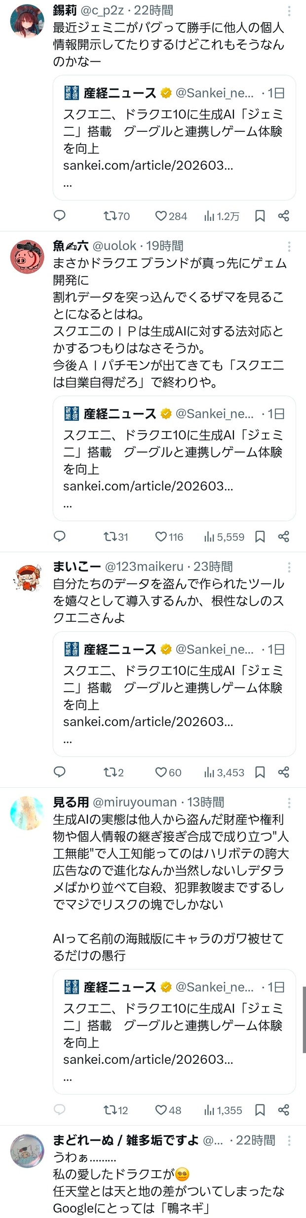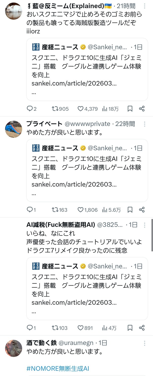 スクエニは、対話型AIを搭載した相棒キャラクター「おしゃべりスラミィ」を開発した。プレーヤーがスラミィにチャット機能を使って話しかけると、音声を自動で生成して会話してくれる。— 産経ニュース (@Sankei_news)