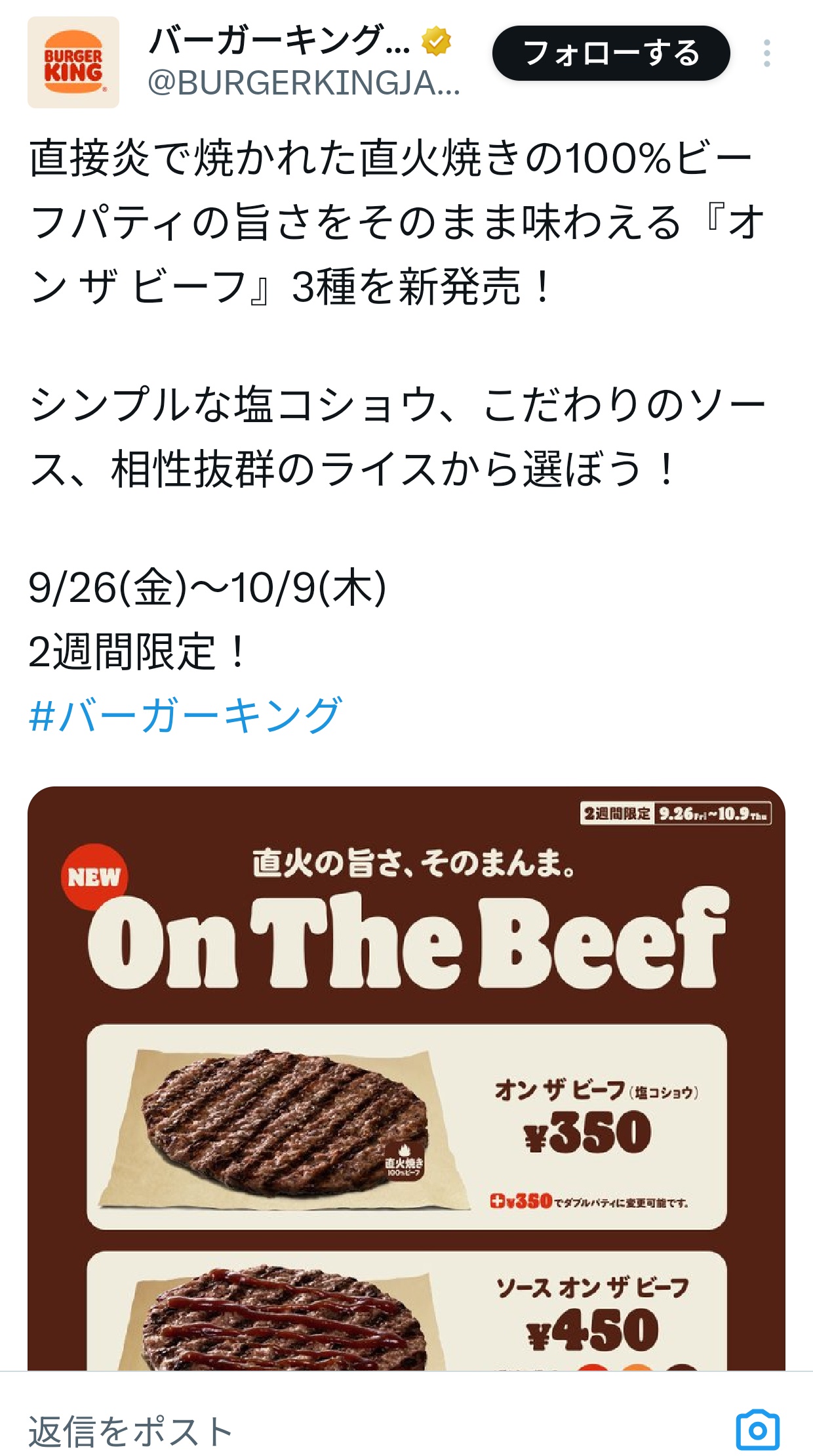 1 : 以下、?ちゃんねるからVIPがお送りします :2025/09/25(木) 19:41:03.012 ID:Qf1J/EaT0.net誰が買うのこれ直接炎で焼かれた直火焼きの100%ビーフパティの旨さをそのまま味わえる『オン ザ ビーフ』3種を新発売!シンプルな塩コショウ、こだわりのソース、相性抜群のライスから選ぼう!9/26(金)~10/9(木)2週間限定!#バーガーキング pic.twitter.com/MxMS4OywFc— バーガーキング・ジャパン (@BURGERKINGJAPAN) September 25, 2025転載元スレッド:https://viper.2ch.sc/test/read.cgi/news4vip/1758796863/